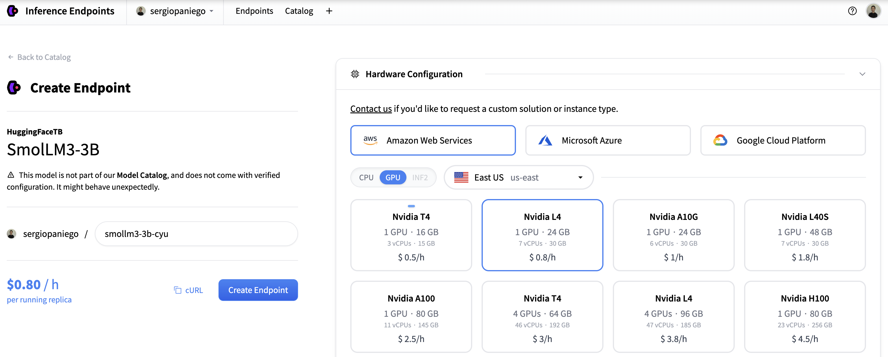 The catalog provides models optimized for vLLM, including GPU settings and inference engine configurations. You can monitor the endpoint and update the container or its configuration from the Inference Endpoints UI.